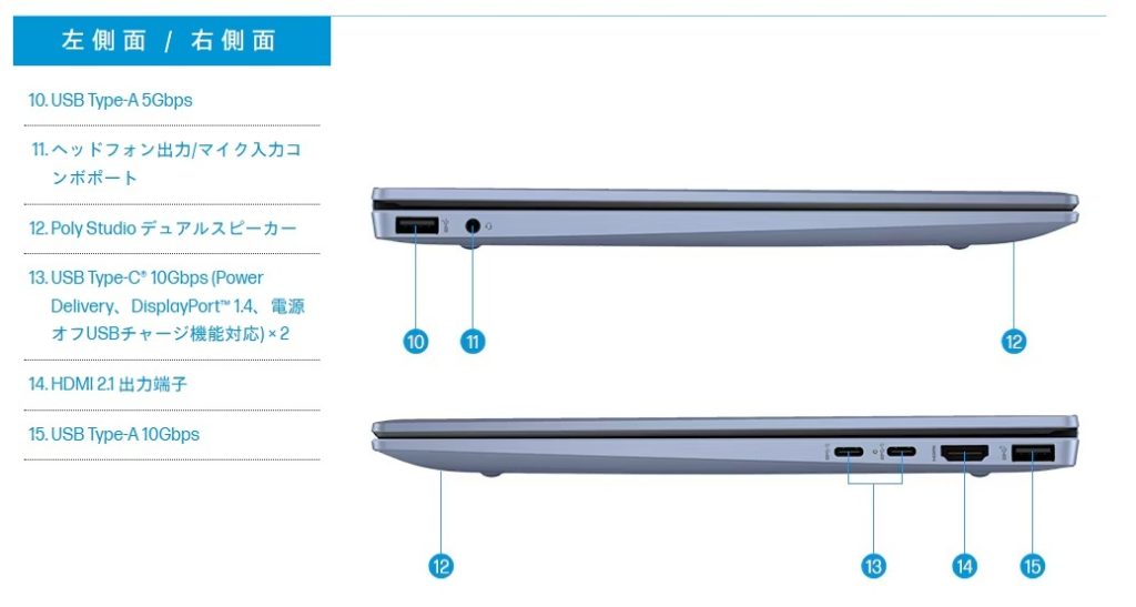 HP Pavilion Aero 13-bgと検索し、メーカーのホームページ内の製品詳細欄を確認すると、パソコンのインターフェースの名称の13番の欄に「USB Type-C (Power Delivery、DisplayPort1.4)」と記載がある。
