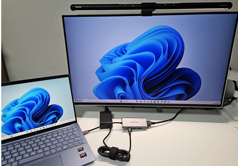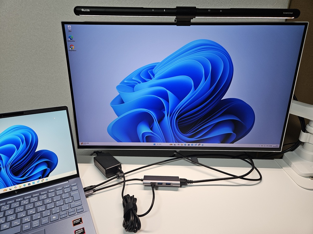 上記写真のように「Type-Cハブ+HDMIケーブルでパソコンとモニターを接続すること」と「Type-Cケーブルでパソコンとモニターを接続すること」を同時に行う。