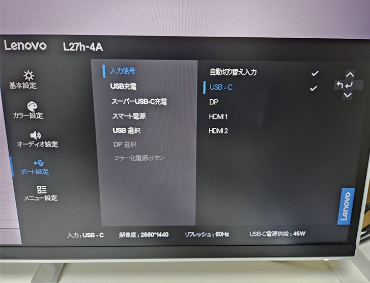 この時はモニターの設定はHDMI端子による映像出力となっているので、それを「USB-C」へと切り替える。