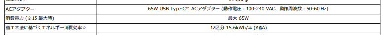 私の持っているパソコンHP Pavilion Aero 13-bgのスペックを確認すると「消費電力 最大65W」と記載がある。