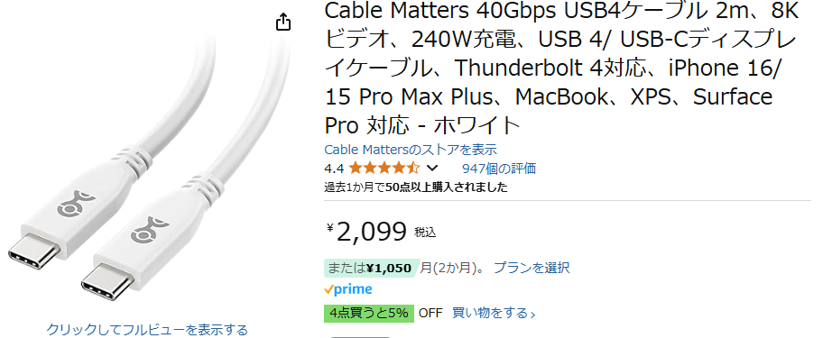 Cable Mattersのケーブルである。このケーブルは他のThunderbolt4ケーブルの半額程度である、、騙されたかもしれねぇ、、