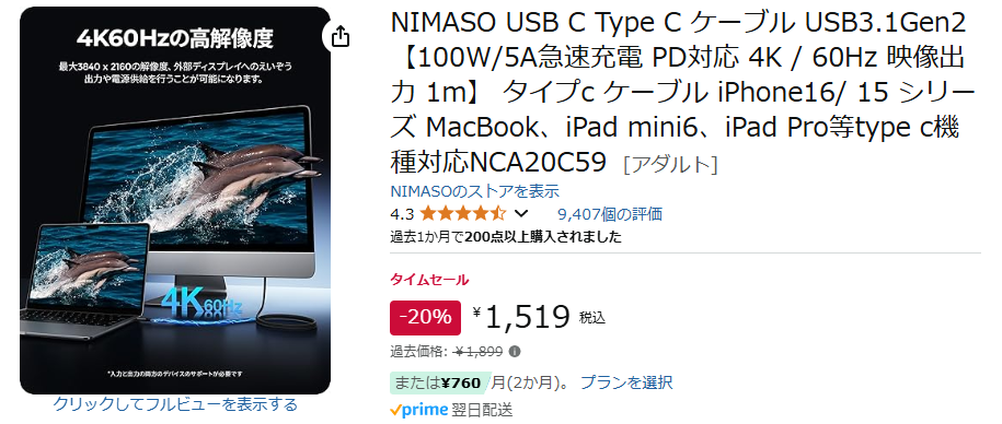 そしてその条件を満たすType-Cケーブルは下記である。